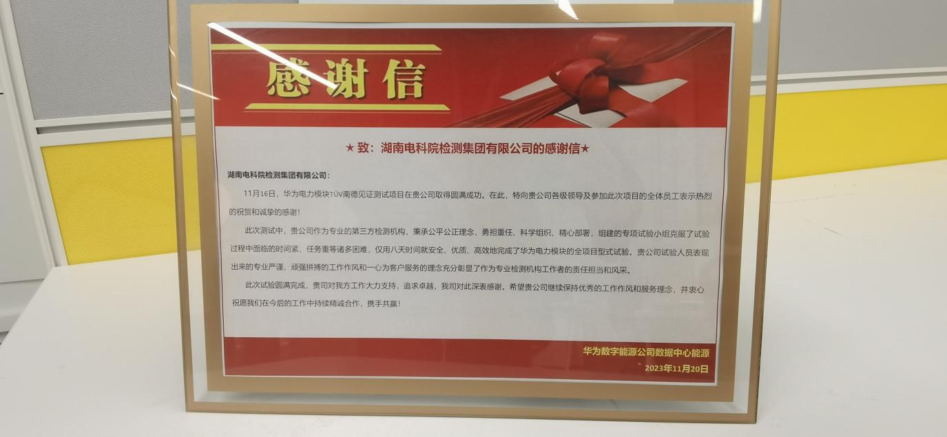 華為數字能源公司的感謝信是對我司檢測能力和服務理念的肯定。未來我司將繼續秉承公平公正理念,為客戶提供專業、規范、優質、高效的服務,進一步助力公司在新的戰略機遇期實現高質量發展。